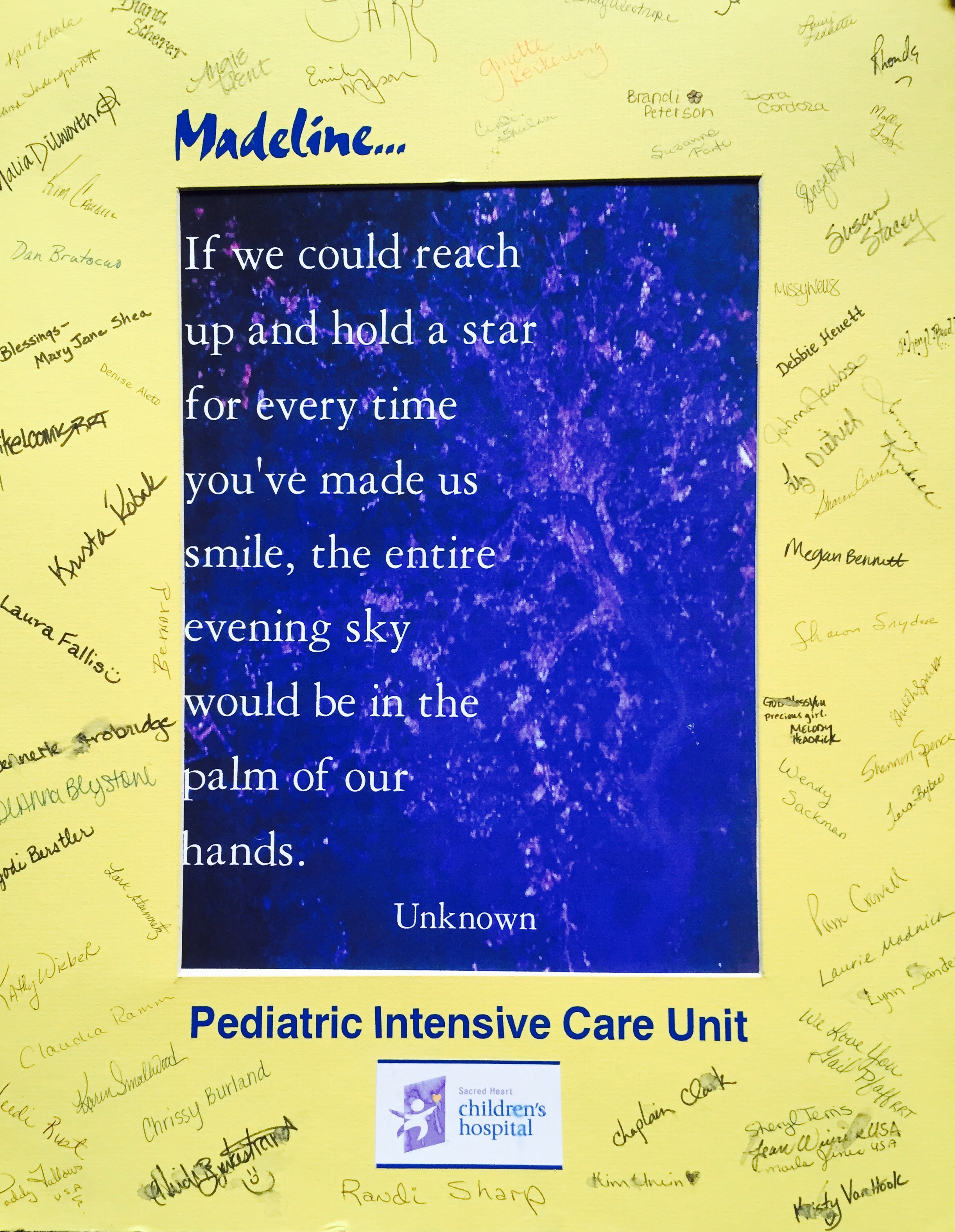 Today, I look back fondly on the Sacred heart PICU, my home for at least 15 hours a day for 7 long months. I know much good came from Madeline’s time there, and I will ever be grateful that, even though she can’t walk and she can’t talk, we were able to take her home and take care of her.
